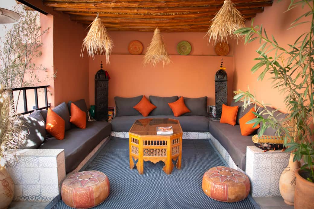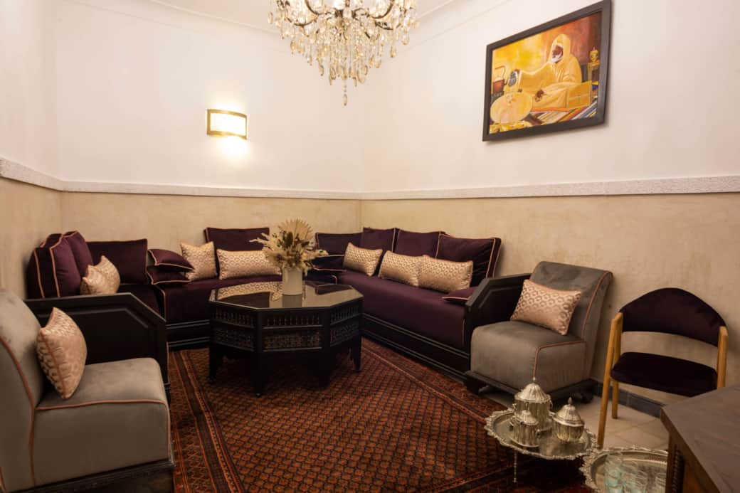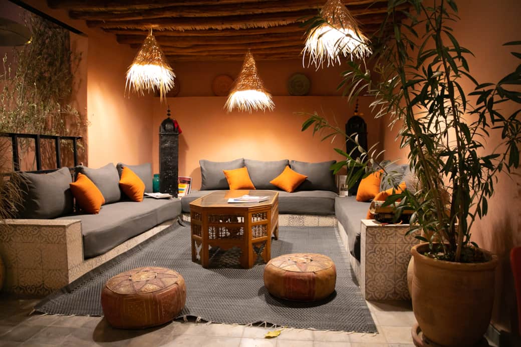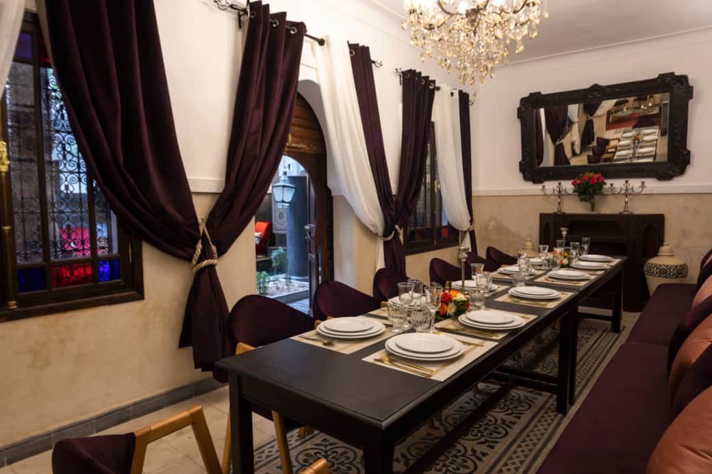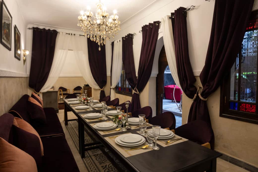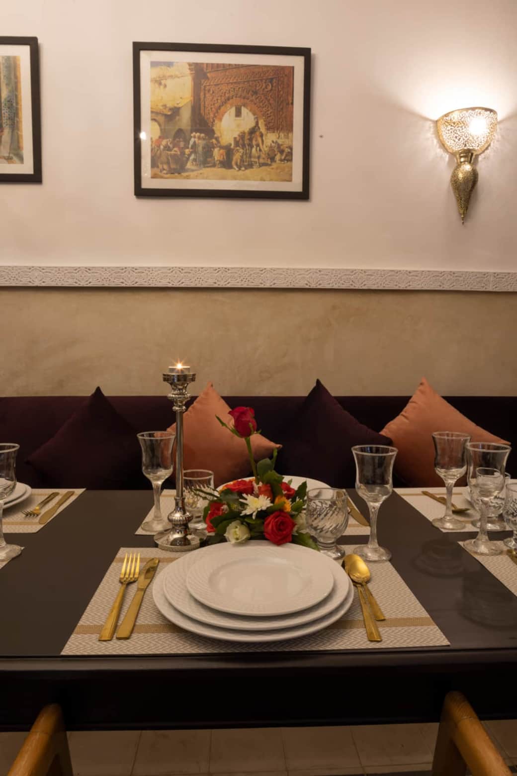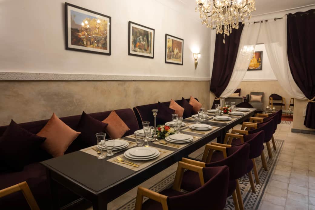 Nichée au cœur du riad, notre salle restaurant est un lieu intime où l’art de la table marocaine rencontre l’élégance d’un décor raffiné. Les murs aux teintes douces et les détails soigneusement choisis créent une atmosphère chaleureuse, idéale pour partager un repas en toute convivialité.